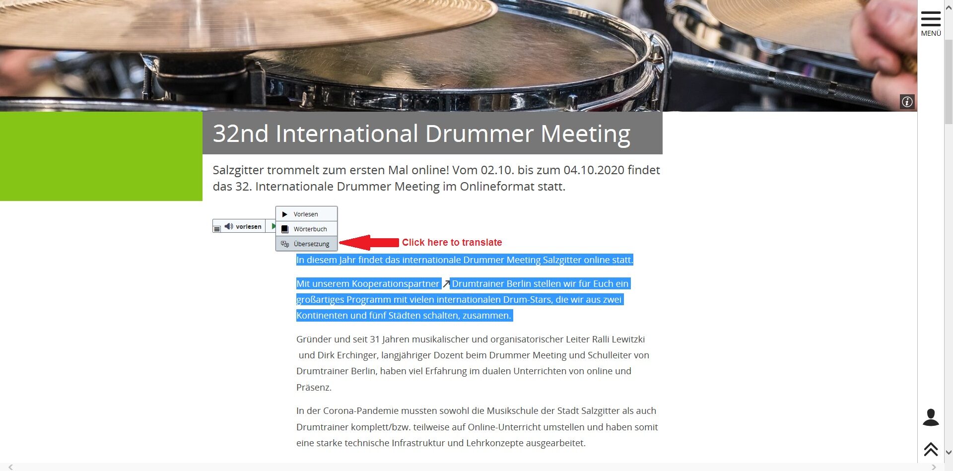 - When the gray window opens, click on “Übersetzung” (Translation)