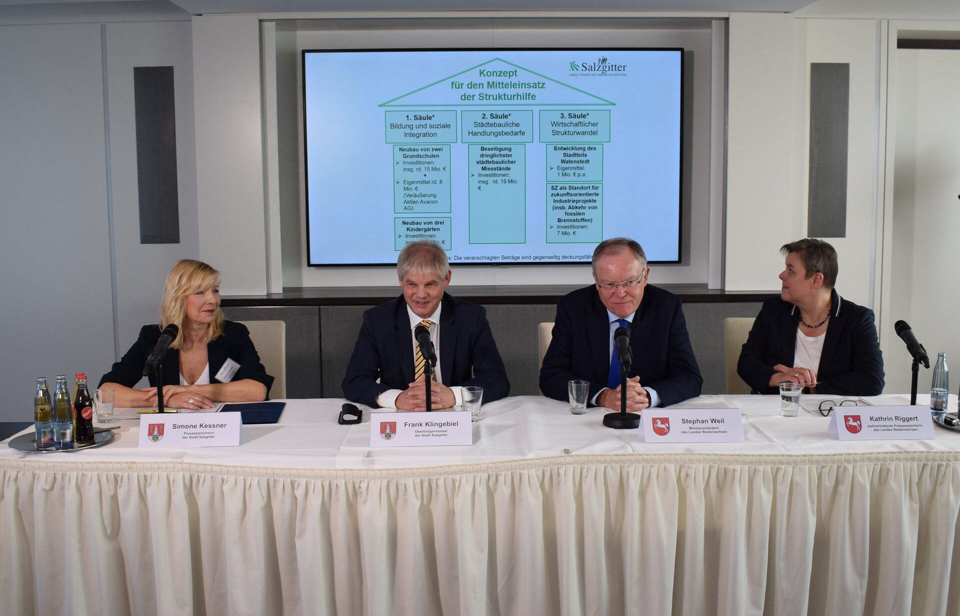 Ministerpräsident Stephan Weil und Oberbürgermeister Frank Klingebiel sind sich darüber einig, dass mit der Strukturhilfe des Landes nicht alle Probleme der Stadt sofort gelöst werden können, diese Salzgitter aber entscheidend voranbringen wird und positive Perspektiven für die Stadtentwicklung eröffnet.