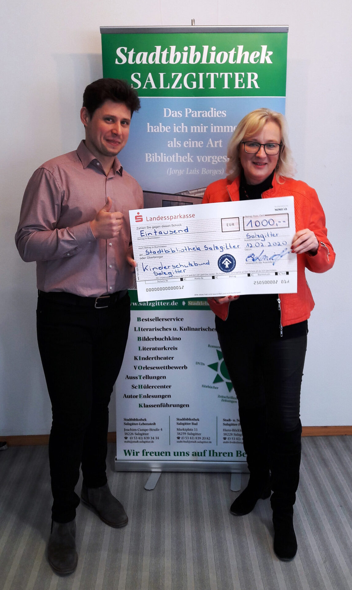 Eugen Schmidt, 1. Vorsitzender des Kinderschutzbundes in Salzgitter, übergab der kommissarischen Leiterin der Stadtbibliothek der Stadt Salzgitter, Barbara Henning, einen großzügigen Scheck in Höhe von 1.000 Euro.