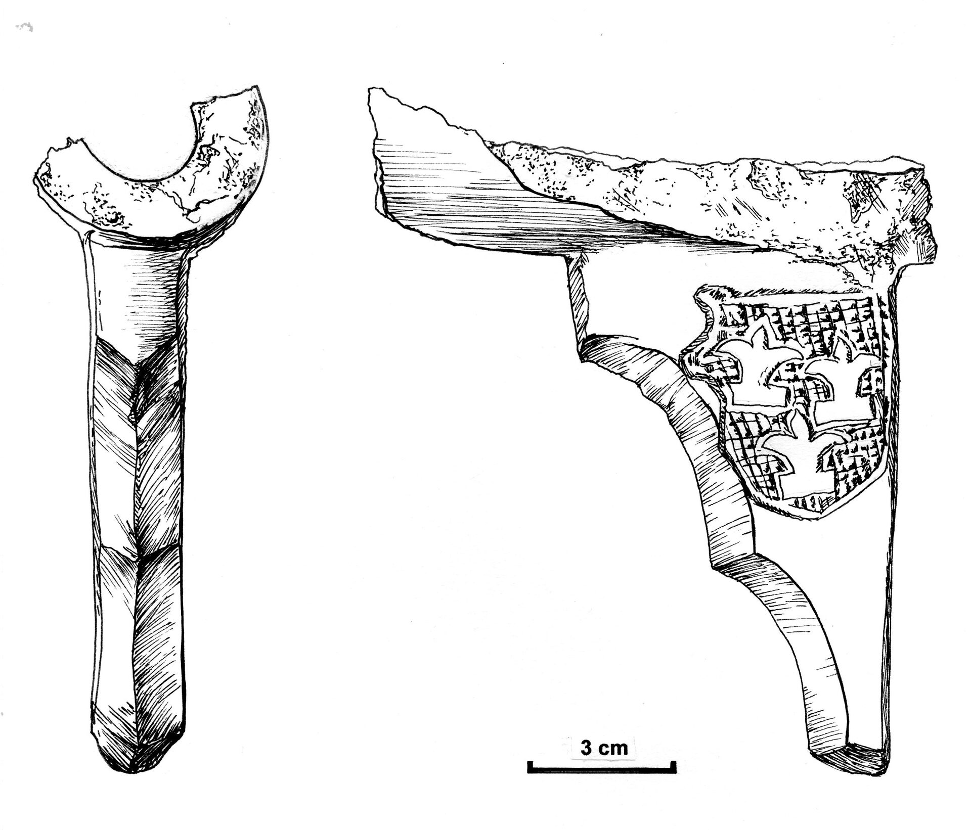 Eine Seite des Hakenbüchsen-Fragments mit dem Wappen der von Cramm und Vorderansicht