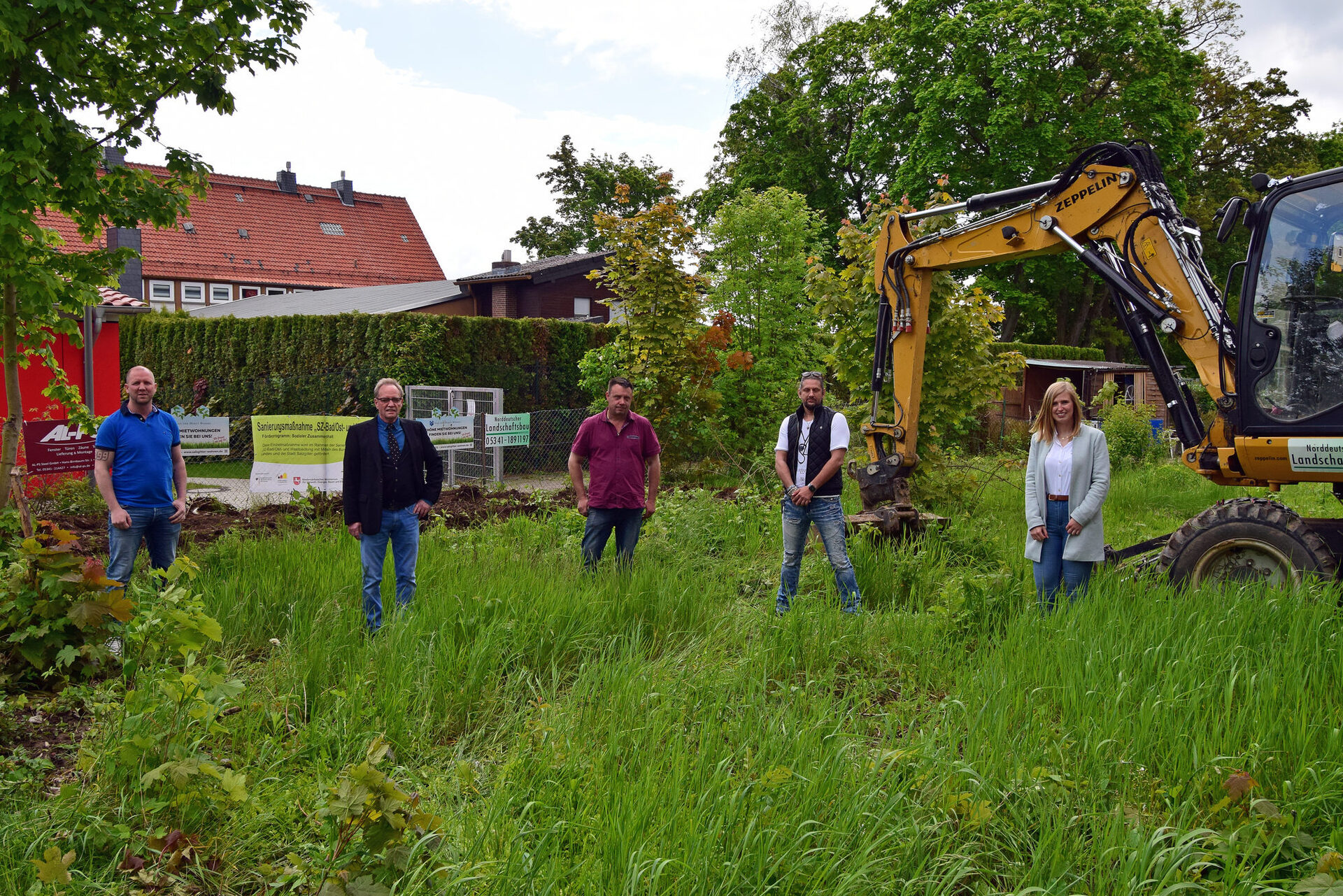 Denn: Der Stadtteilgarten soll ein grüner Begegnungsraum für die Menschen und von den Menschen des Quartiers werden. Dafür gibt es bereits eine Arbeitsgemeinschaft (AG) Garten, die sich regelmäßig (derzeit online) trifft, um über den weiteren Fahrplan zur Umsetzung und Ideenfindung auszutauschen. Beim nächsten Treffen am Montag sind die Baggerarbeiten beendet; die Pläne für die Zäune werden vorgestellt und die Ideen zum Pflanzen können bald umgesetzt werden. Der Norddeutsche Landschaftsbau hat dafür zwei Laster-Ladungen Humus zugesagt, damit die Pflanzen eine gute Grundlage zum Wachsen haben und vielleicht noch zum Erntedankfest gemeinsam geerntet werden kann…