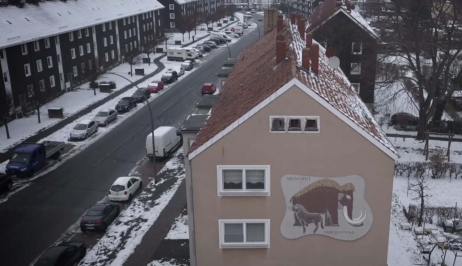 Zu finden sind diese farbigen Tierfresken an zwei Mehrfamilienhäusern aus den 1950er-Jahren im Pappelweg und in der Reppnerschen Straße von Salzgitter-Lebenstedt. Mammut, Fellnashorn und Wildpferd sind zu sehen.