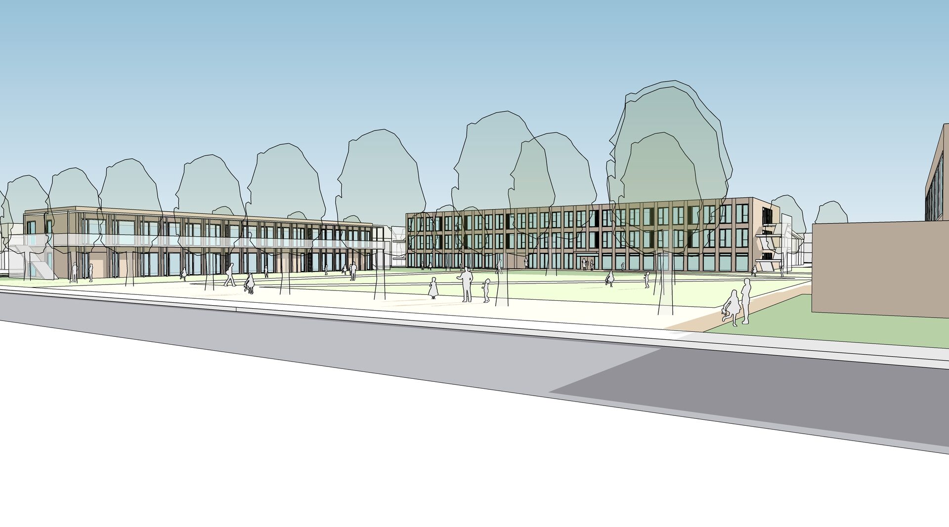• Die Grundschule ist als dreigeschossiger, rechteckiger Bau von etwa 64 Meter x 23 Meter geplant. Im Endgeschoss soll es eine Mensa, Betreuungsräume sowie eine Bibliothek geben. In den Obergeschossen sind die Unterrichtsräume sowie Sanitäranlagen geplant. Der Bau wird in Raummodulbauweise in Holzbau mit einem Flachdach mit Gefälledämmung (inkl. großflächiger Bekiesung oder Gründach) umgesetzt. Die Außenwände erhalten eine Holzverschalung aus Lärchenholz. Die Wärmeversorgung stellt eine elektrisch betriebene Luft-/Wasser-Wärmepumpe auf dem Dach sicher. Dort sollen auch Photovoltaikmodule Strom für den Eigenbedarf erzeugen.