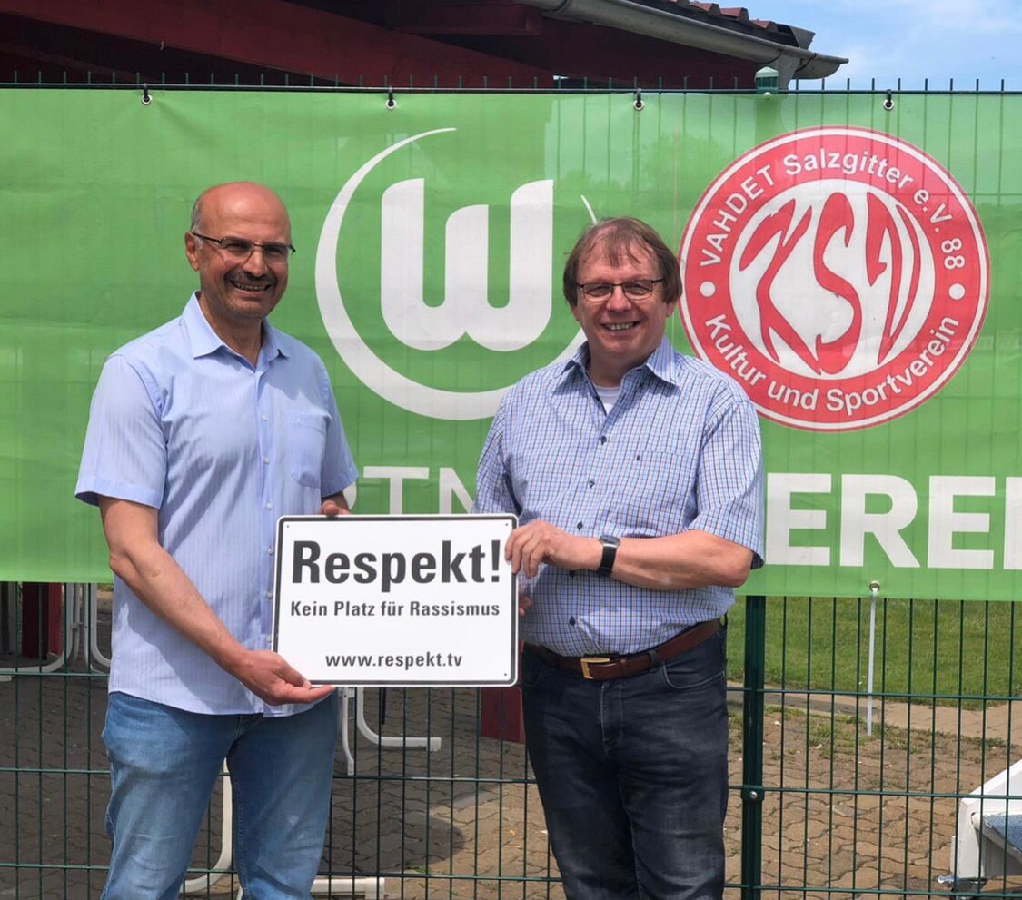 Stadtrat Dr. Dirk Härdrich und Sebastian Hendris vom Referat Sozialplanung und Integration der Stadt Salzgitter übergaben dem 1. Vorsitzenden Ibrahim Medeni im Rahmen des Landesliga-Spiels gegen Germania Lamme das „Respekt“- Schild.