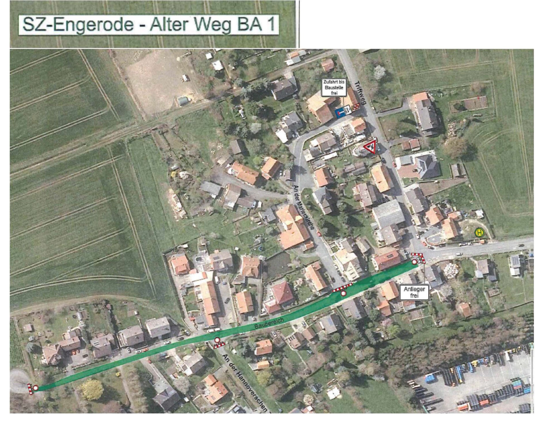 - Der 1. Bauabschnitt vom 6. April bis 7. April umfasst den hinteren Bereich ab Triftweg bis zum Wendeplatz. In dieser Zeit kann dieser Bereich sowie die Straße An der Hannoverschen Treue nicht von Fahrzeugen benutzt werden.