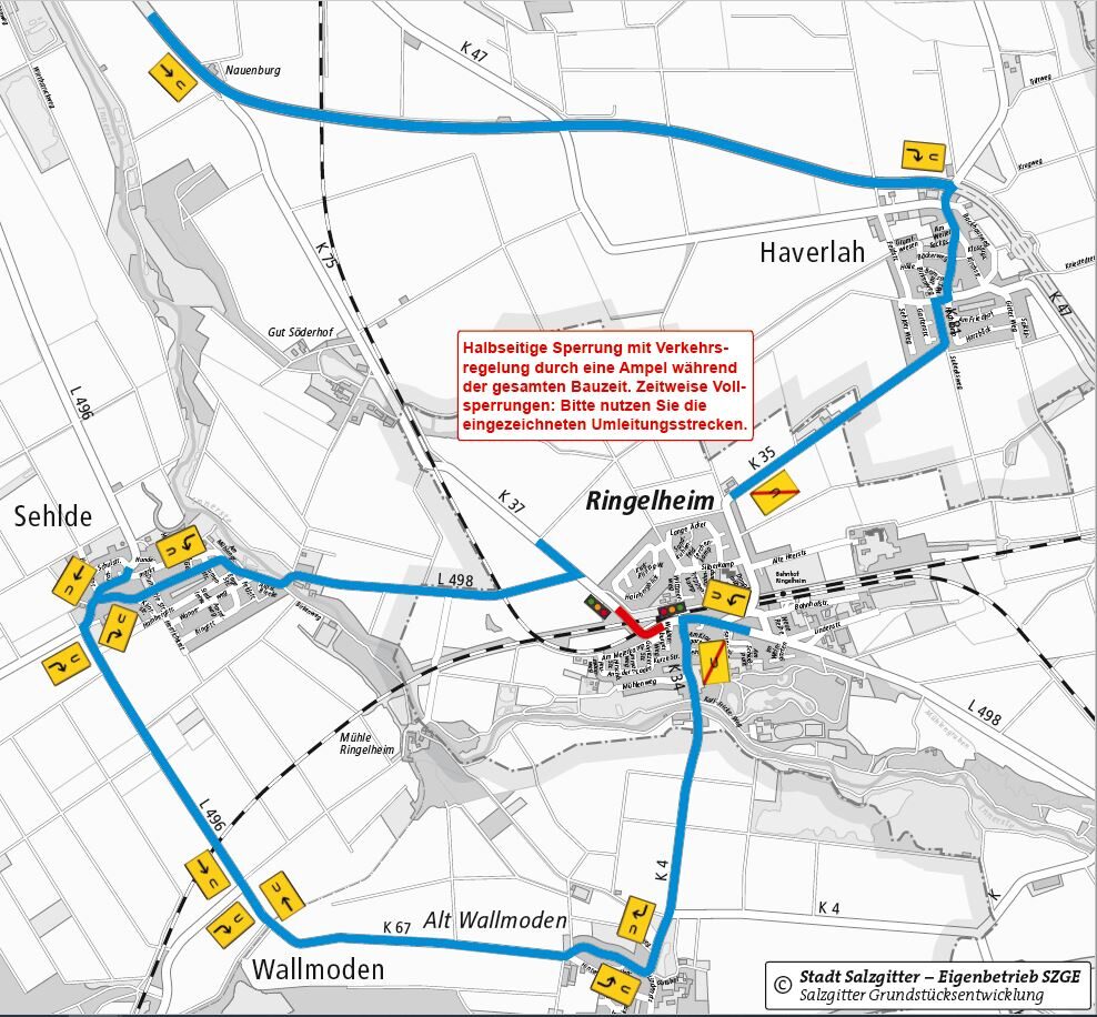 Für eine leistungsstarke Infrastruktur erneuert die Deutsche Bahn (DB) die Eisenbahnüberführungen in Salzgitter. Geplant ist die Erneuerung von der zwei Eisenbahnbrücken über die L498 in Salzgitter-Ringelheim. Die Arbeiten haben Anfang Januar 2023 begonnen und sollen gemäß aktueller Planung bis 31.07.2024 abgeschlossen sein.