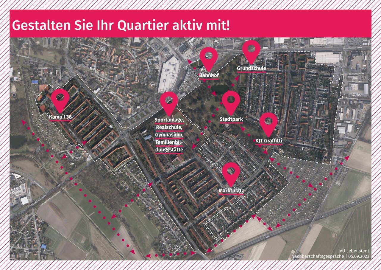 Nach der Auftaktveranstaltung in der Aula im Kranichgymnasium am 5. Juli, einer Online-Befragung, Gesprächen mit Vertreterinnen/Vertretern von sozialen und Bildungseinrichtungen sowie Gewerbe, folgen im September nun die Nachbarschaftsgespräche.