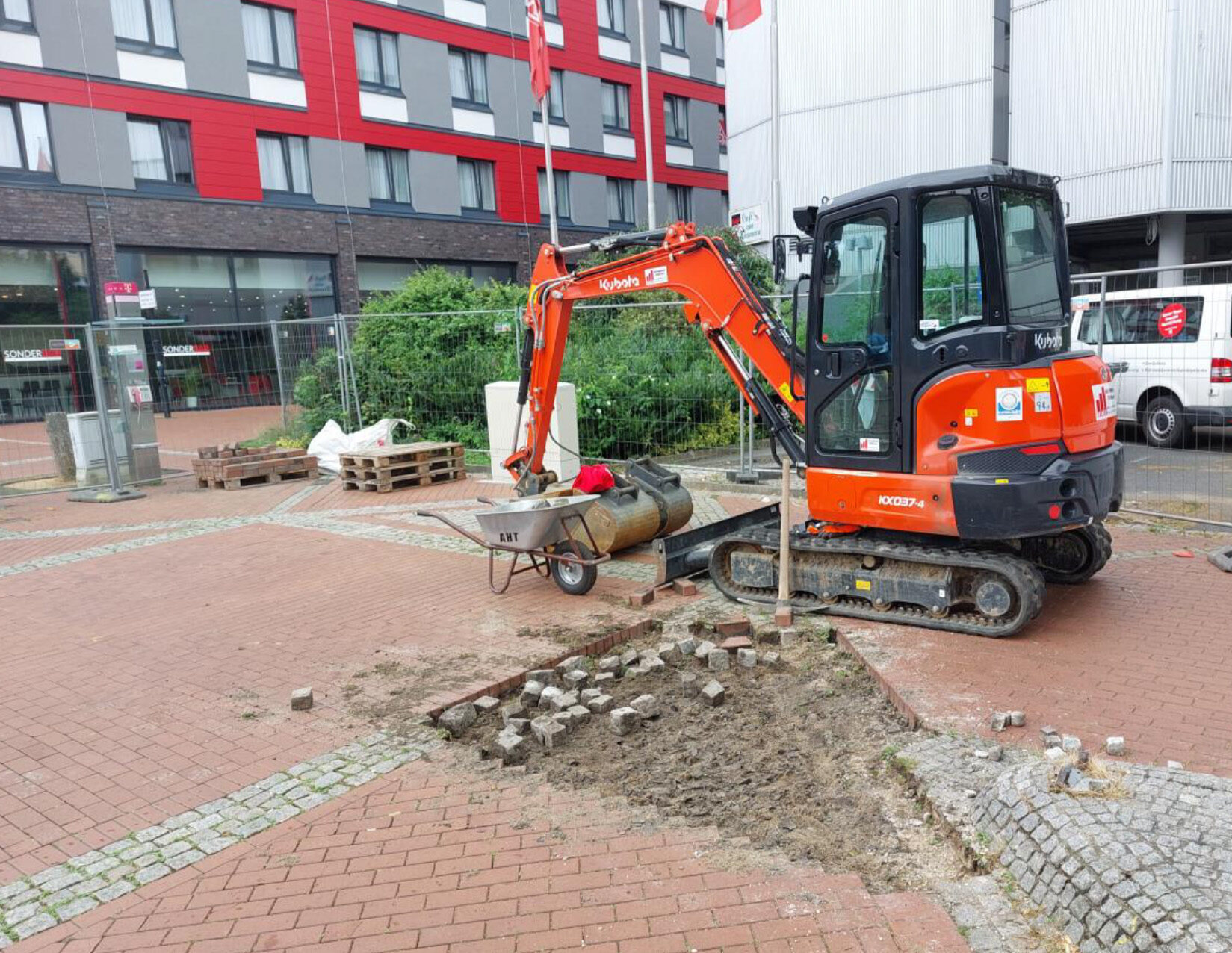 Bis Mitte August soll hier in zentraler Lage ein Toilettenhäuschen mit barrierefreier Behindertentoilette als Zweiraumanlage entstehen. Optisch wird sich die Anlage an der Fassade des Dormero Hotels orientieren und mit einem Gründach versehen werden.