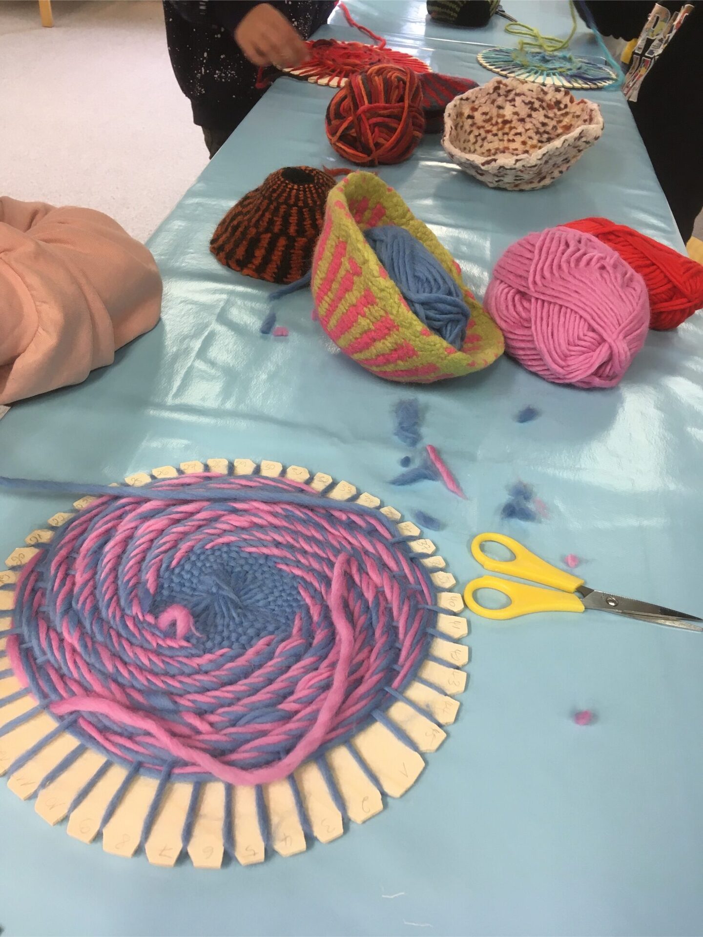 Diesmal können die teilnehmenden Kinder unter der Anleitung von Textildesignerin Silke Schnau ein Osterkörbchen erstellen. Für das Osterkörbchen wird Filzwolle verwendet. Auf einer Scheibe im Kreis verwebt und mit ein paar Tricks sowie einem Waschgang in der Waschmaschine (zu Hause) entsteht so ein Körbchen aus Wolle.