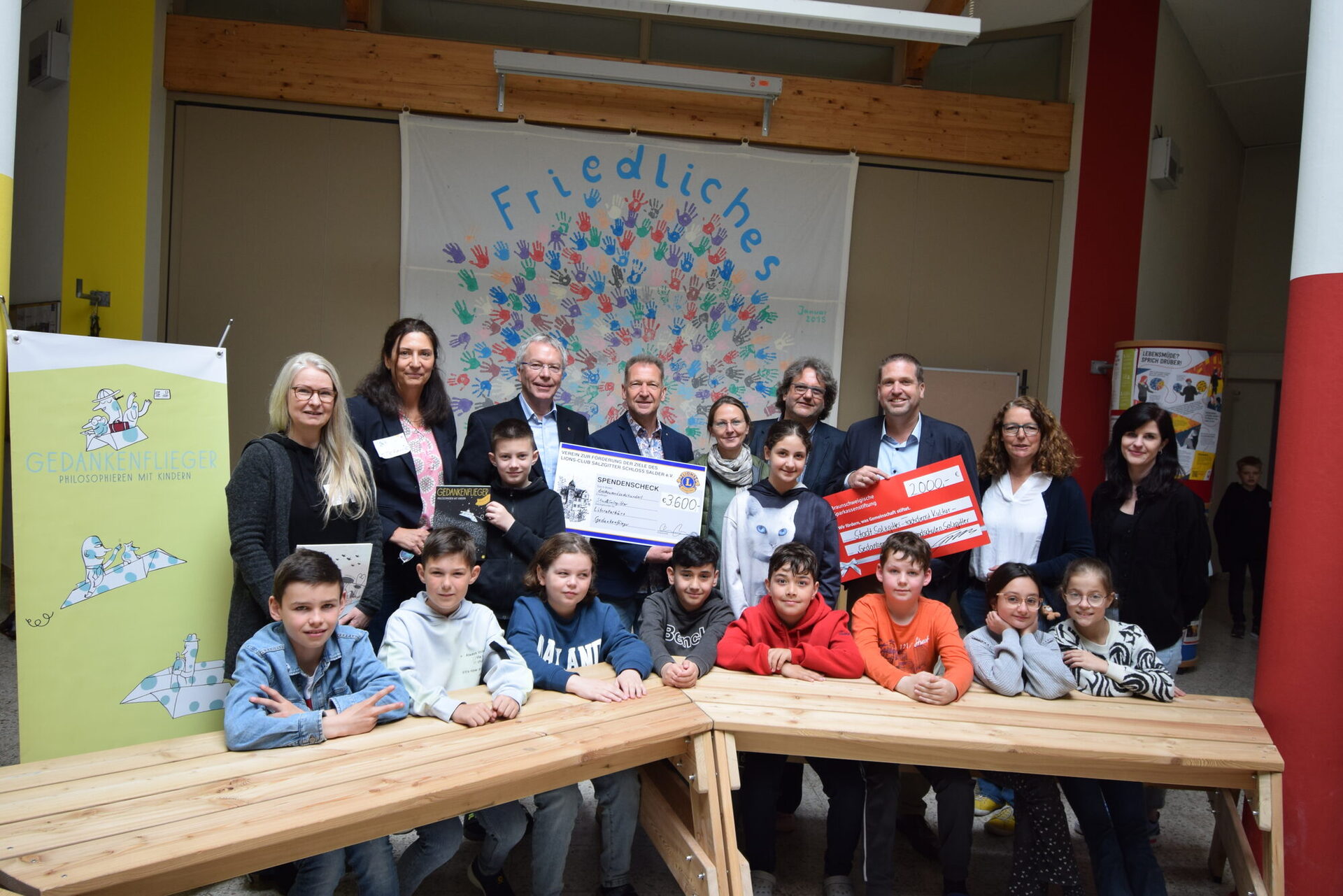 In diesem Jahr nahm für die Stadt Salzgitter Fachdienstleiter Kultur Hartmut Schölch die beiden Förderschecks der Braunschweigischen Sparkassenstiftung (in Höhe von 2.000 Euro) aus den Händen von Franco Canosa (Regionalbeirat der Braunschweigischen Landessparkassenstiftung und Leiter Bereich Firmenkunden) und Thomas Wolff (Leiter der Landessparkassen-Filialen Salzgitter) sowie vom Verein zur Förderung der Ziele des Lions-Club Salzgitter Schloss Salder e. V. (in Höhe von 3.600 Euro) vertreten durch den Präsidenten des Lions-Club Salzgitter Schloss Salder, Wilfried Berg und den Vorsitzenden des Vereins zur Förderung der Ziele des Lions-Club Salzgitter Schloss Salder Jens Bogdan, entgegen. Bei der symbolischen Scheckübergabe in der Grundschule Dürerring am Fredenberg waren dabei: Dr. Aneka Viering vom städtischen Literaturbüro, die beiden "Gedankenflieger"-Referentinnen Stefanie Segatz und Anne Jaspersen, Schulleiterin Christel Jamaszyk sowie die Kinder der 4b der Grundschule Dürerring mit ihrer Klassenlehrerin Lisa Strothmann.