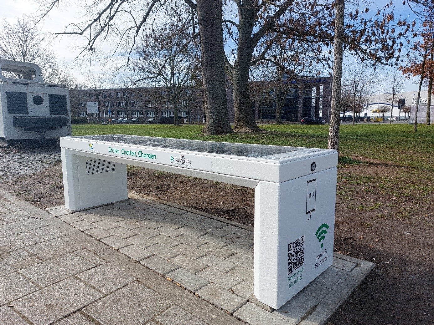 Dabei handelt es um zwölf Solarbänke im Bereich der Chemnitzer Straße sowie zwischen der Bushaltestelle Bahnhof/ZOB und dem Bahnhof Lebenstedt. Diese dienen nicht nur als zusätzliche Sitzmöglichkeiten: Frei nach dem Motto „chillen-chatten-chargen“ werden auch smarte Funktionen geboten. So verfügen die Bänke, jeweils über zwei USB-Ladebuchsen und QI-Ladeflächen für Smartphones, die kabelloses Laden unterstützen, einfach per Auflegen.