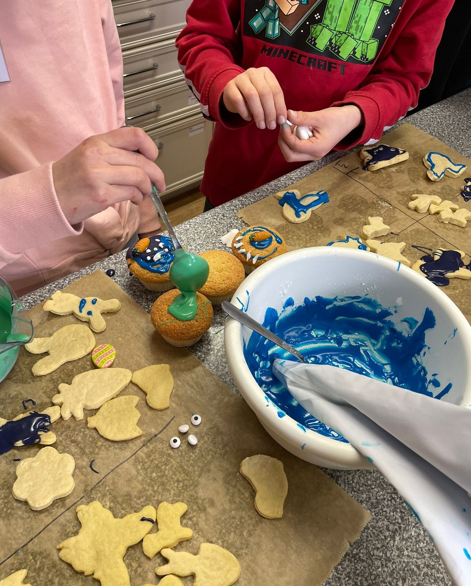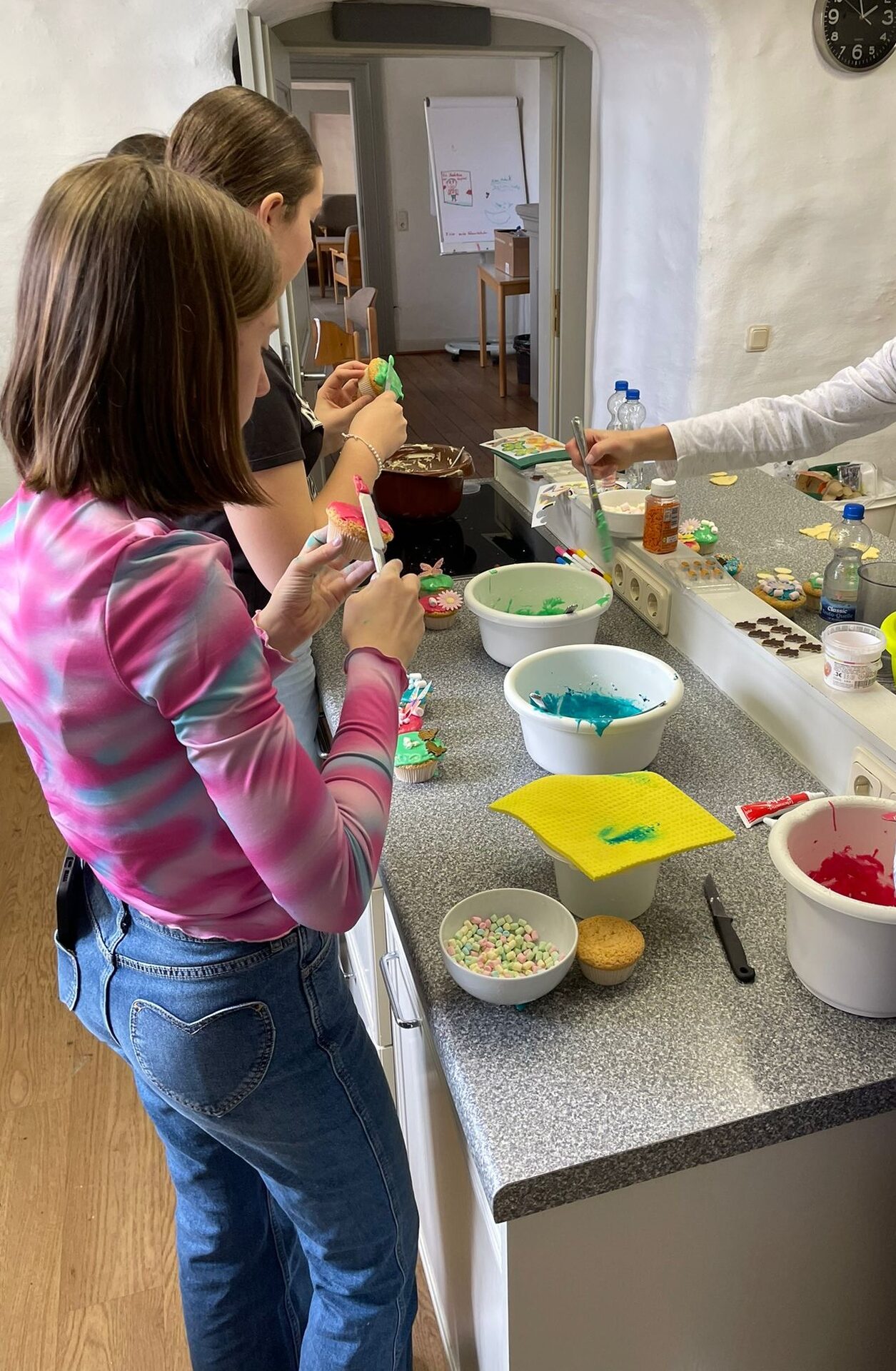 Gemeinsam wurden Kekse, Cupcakes, kleine Kuchen und Hefezöpfe gebacken. Alles wurde individuell und sehr kreativ verziert – Hasenkekse, Cupcakes mit Ostereier, Hasen, Möhren und Schmetterlingen. Und natürlich sollten die selbst gemachten Köstlichkeiten auch in phantasievollen Verpackungen verschenkt werden.
