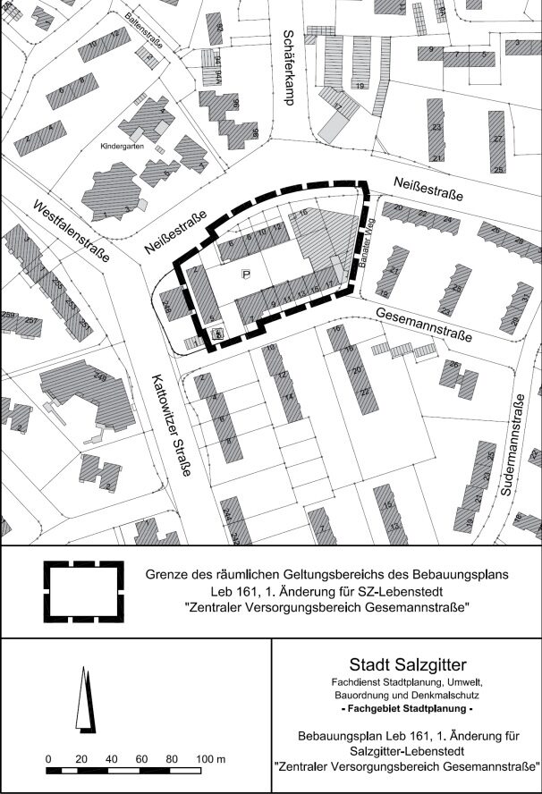 Für den Bebauungsplan Leb 161, 1. Änderung für Salzgitter-Lebenstedt „Zentraler Versorgungsbereich Gesemannstraße“ ist Ziel der Planung die Festsetzung eines Sondergebietes mit der Zweckbestimmung „Nahversorgungszentrum“ mit größeren überbaubaren Grundstücksflächen und maximal vier Vollgeschossen.