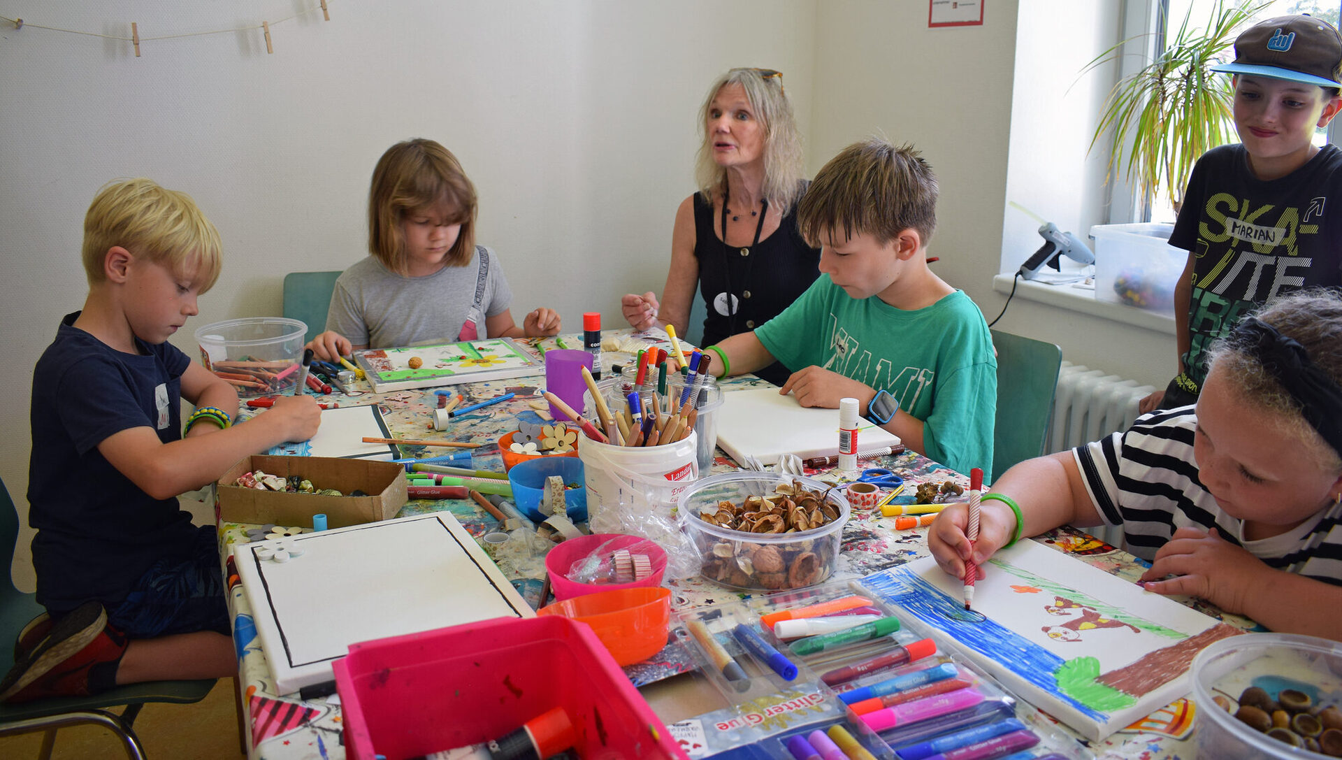 Auf das gemeinsame Essen freuen sie sich ebenso wie auf die vielen anderen Stationen wie beispielsweise die Gestaltung der Keilrahmen mit Naturmaterialien. Doch der Tisch ist gerade besetzt. Samantas Bild ist fast fertig. „Ein Geburtstagsgeschenk für meine Cousine“, so die Neunjährige, die zum ersten Mal bei den Ferienerlebnistagen dabei ist. Der siebenjährige Max ist zum zweiten Mal dabei und immer wieder begeistert, was er hier mit anderen Kindern machen kann. Das ist der neunjährige Marian ebenfalls, doch er freut sich schon heute auf den Mitmachzirkus, der in der dritten Ferienwoche stattfinden wird…