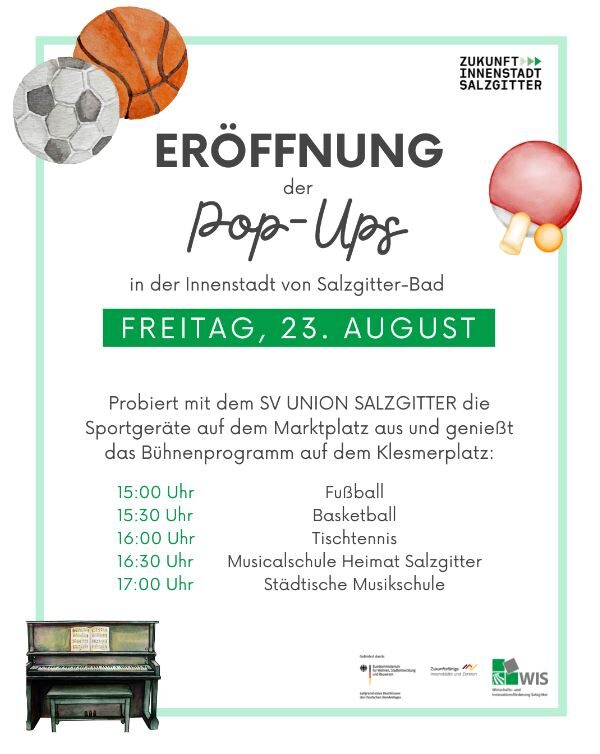 Um das vorübergehende Angebot bekannt zu machen, wird am 23. August eine Eröffnungs-Aktion stattfinden, die von verschiedenen Institutionen unterstützt wird. Ab 15:00 Uhr wird der SV Union Salzgitter zunächst vorstellen, wie es aussieht, wenn echte Könner an den Sportgeräten auf dem Marktplatz tätig werden. Beginnen werden um 15:00 Uhr die Fußballer mit einer nur für diesen Nachmittag aufgestellten „Panna-Arena“, in der sich alle, die Lust haben, im Eins gegen Eins messen können. Um 15:30 Uhr kommen die Basketballer und um 16:00 Uhr die Tischtennisspieler hinzu. Nach einer kurzen Präsentation der Profis des SV Union Salzgitter dürfen sich dann, unter der Anleitung der Trainer, die großen und kleinen Besucher an den Sportgeräten ausprobieren.