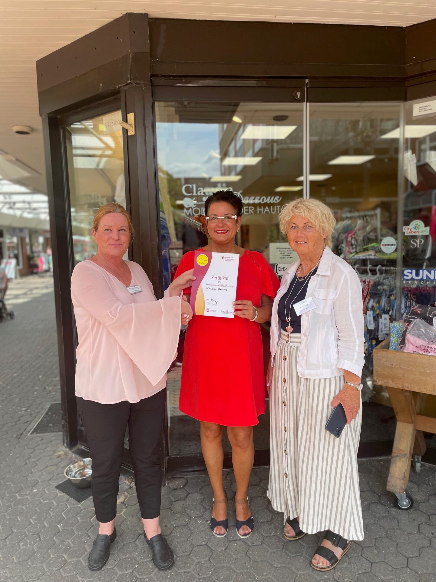 Felizitas Ding (links) und Karin Margner (rechts) überreichten das Zertifikat und Aufkleber an Claudia Neumann von Claudia Dessous.