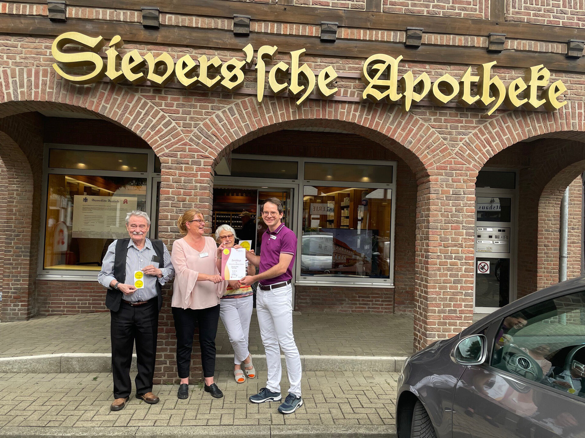 Hans Werner Eisfeld (links), Felizitas Ding und Ingrid Müller (dritte von links) überreichten das Zertifikat an Adrian Sievers , Inhaber der Sievers`sche Apotheke.