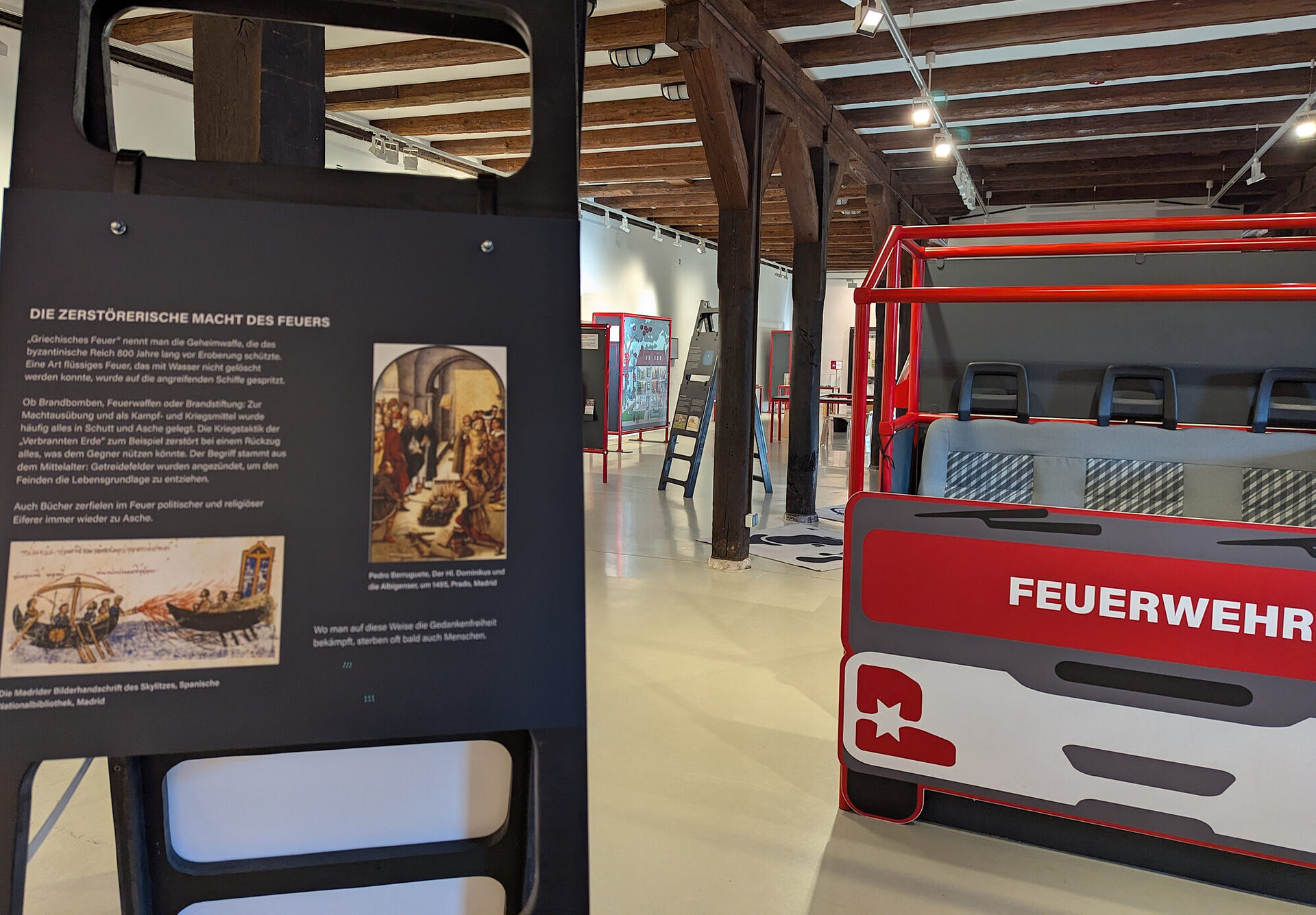 In der Mitmachausstellung „Wer rennt, wenn’s brennt?“ können Kinder der uralten Beziehung der Menschen zum Feuer nachspüren und dabei erfahren, warum es so wichtig war und ist es zu haben, aber noch viel wichtiger es zu beherrschen. An Mitmachstationen können Wissen, Fitness und Teamwork getestet werden.