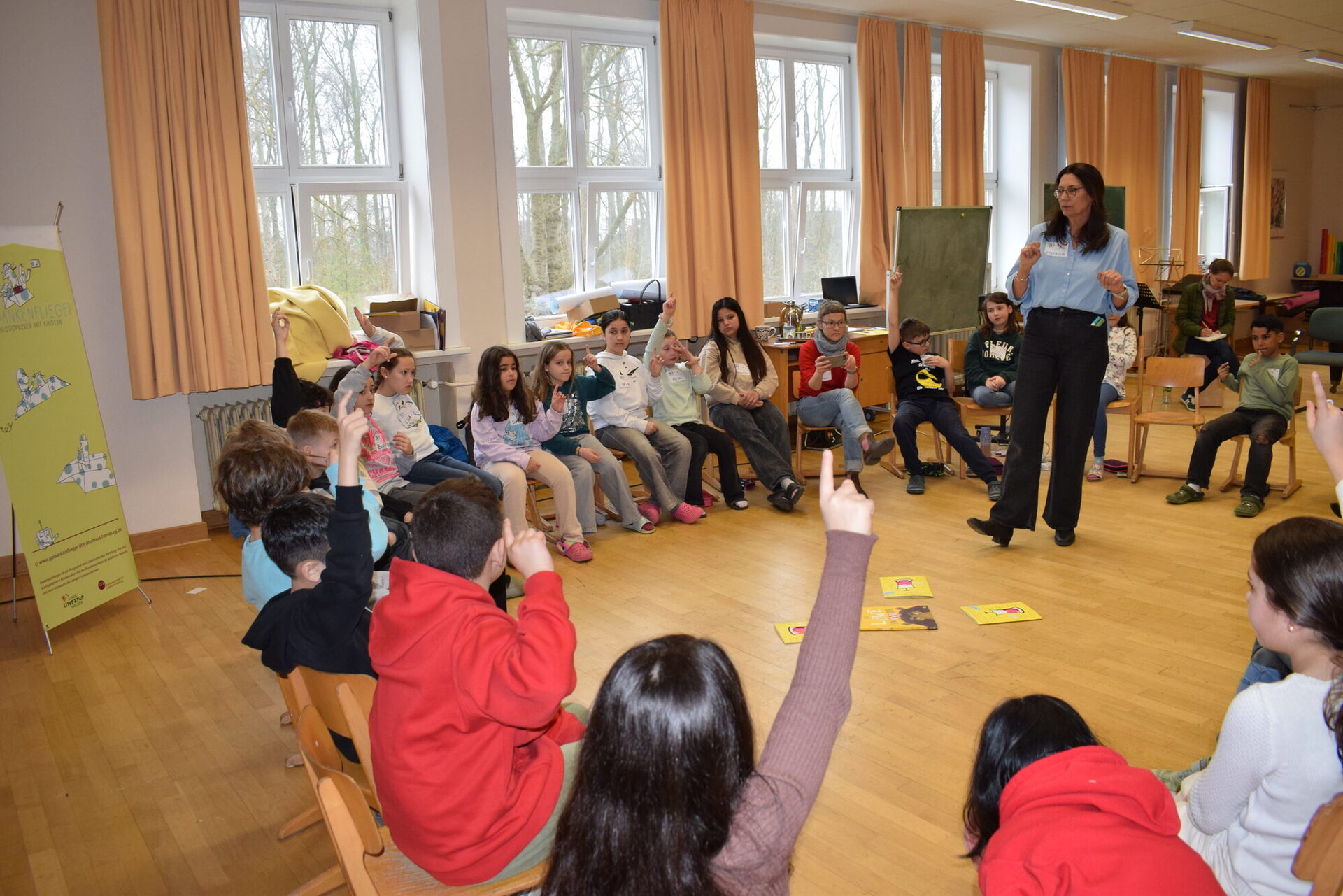 Die Schülerinnen und Schüler der 3b hatten ganz unterschiedliche Antworten auf die Frage "Was bedeutet Mut". Viele davon waren ganz außergewöhnlich und wären wohl nicht jeder oder jedem gleich zu dem Thema eingefallen. So wie: "Mut ist, wenn man nein sagen kann"; "Wenn man seine Angst überwindet". Die Kinder waren sich aber einig: "Angst ist nötig damit man Mut haben kann". Auf die Frage der Referentinnen, was denn dabei helfe, mutig zu sein, kamen Antworten wie: "sich gute Gedanken machen, wie ,Das schaffe ich schon'"; "an sich selber glauben"; "wenn man sich auf eine Aufgabe gut vorbereitet“; aber auch "Wenn andere an einen glauben und unterstützen". Viele der Schüler/innen waren aber auch erstaunt, als ihre Mitschülerinnen und -schüler sagten, sie würden sie für besonders mutig halten. Gelobt wurden sie dafür, dass sie sich für ihre Ideen einsetzen, ihre Meinung frei heraus sagen würden oder schon einmal eine Mitschülerin/einen Mitschüler vor einem stärkeren Mädchen oder Jungen beschützt hatten.
