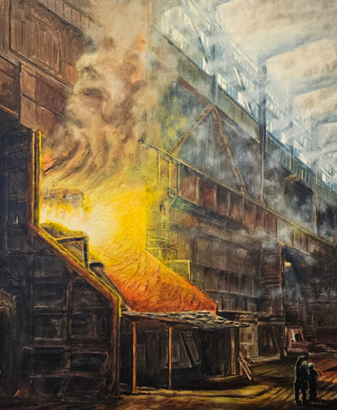 Einen für Salzgitter typischen und aktuellen Arbeitsplatz im Stahlwerk zeigt die Arbeit von Siegfried Langner mit dem Titel „Der Konverter“ von 1995. Zu sehen sind eine riesige Halle, die Übermächtigkeit der Maschinerie und die Gefährlichkeit durch das brodelnde wabernde „Feuer“. Im Vordergrund sind ganz klein zwei Arbeiter in Rückenansicht dargestellt, die der Betrachterin/dem Betrachter helfen, die erstaunlichen Größenverhältnisse einzuschätzen. Die Arbeit Gerd Winners steht für Erzeugnisse aus Stahl. Er hat mit der Kamera anonyme Zweckbauten aus der Zeit der Industrialisierung fotografiert, diese verarbeitet und in einer betont sachlich-nüchternen Bildsprache festgehalten. Reproduziert wurden die Arbeiten als Siebdrucke, die die Strukturen der Stahlkonstruktionen besonders plastisch hervortreten lässt. Edward B. Gordon zeigt mit seiner Arbeit „Im Stahlwerk“ eine typische Arbeitssituation. Ebenso wie die Arbeiten des Fotografen Uwe Brodmann, der die Mitarbeitenden des Stahlwerks bei ihren Tätigkeiten mit der Kamera begleitet hat.