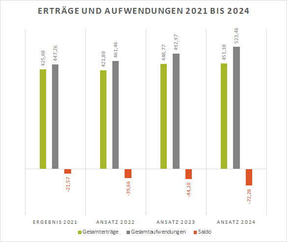 Unter Herausrechnung der Flüchtlingskosten – für kurzfristige Unterbringung genauso wie für langfristige Integration (17.093 T€ in 2023 und über rund 19.00 T€ in 2024 ff) – lässt sich in allen Jahren des Gesamtplanungszeitraums ein Überschuss darstellen und der Haushaltsausgleich erreichen. Im Jahr 2023 ergibt sich ein Planüberschuss von 17.135 T€, in 2024 ein Planfehlbedarf von nur noch 3.112 T€. Im Gesamtplanungszeitraum bis 2027 ergibt sich ein Überschuss von 52.587 T€.