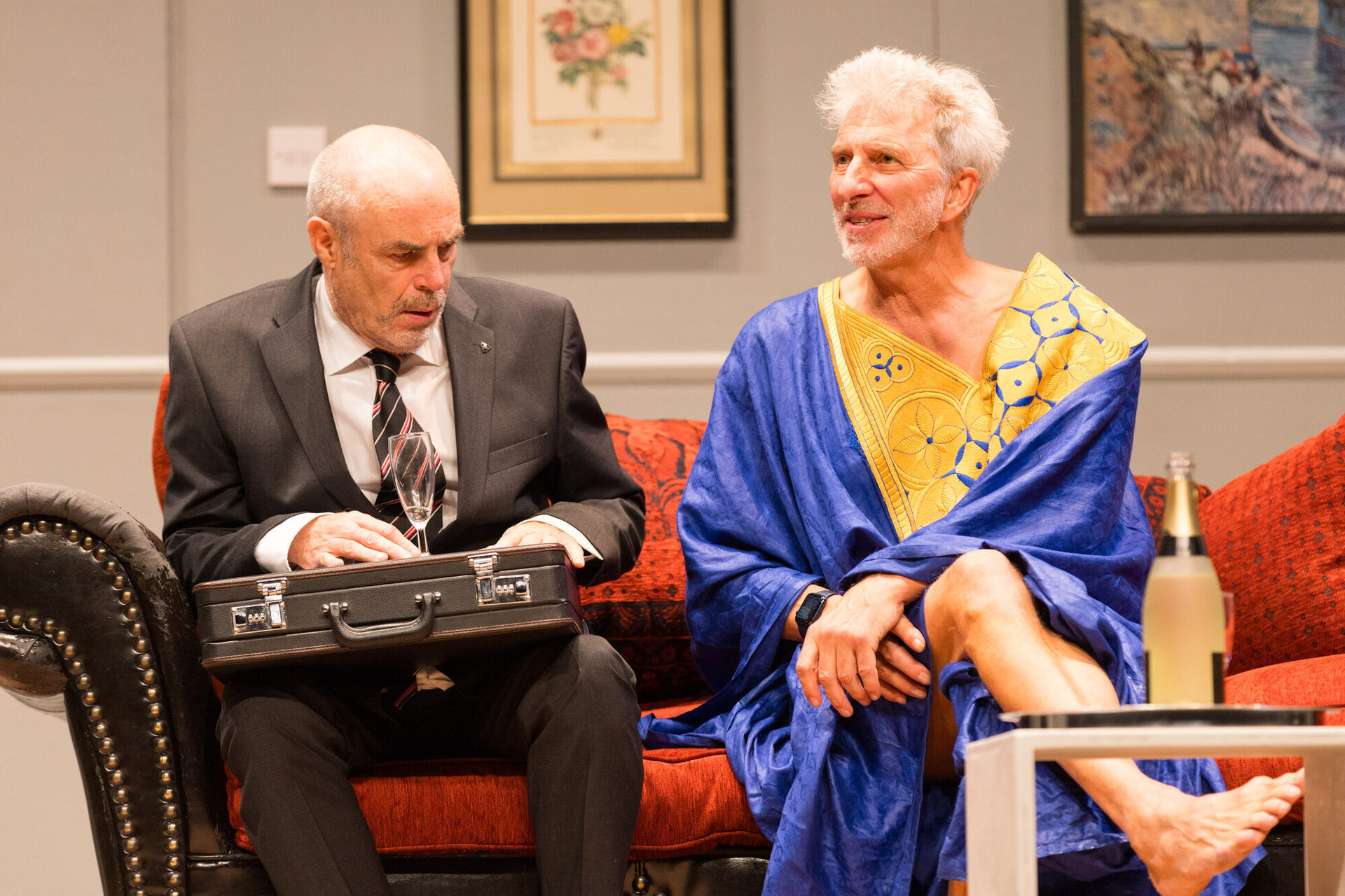 Wie er dies versucht, ist jedoch an Absurdität nicht zu überbieten. Und Catherine ist so einfach nicht zu überzeugen – sie hat schließlich gesehen, was sie gesehen hat… Die bürgerlich heile Fassade hat einen gewaltigen Riss bekommen. Und so entlädt sich aufgestauter Ehefrust – nichts scheint mehr zu retten. Oder doch? Zunächst aber braucht es eine groteske, temporeiche Jagd aus Lügen, Verstrickungen und Verwicklungen…